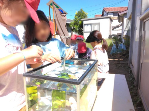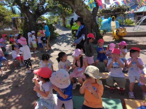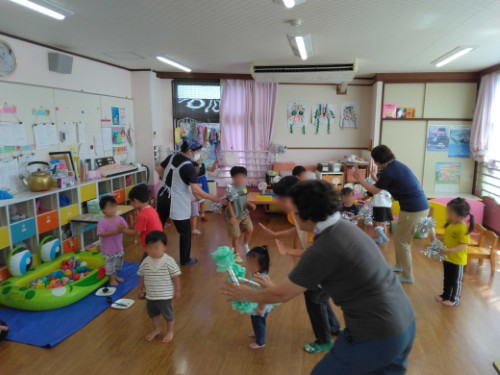 7月18日 年長さん 夜まで保育を行いました。 みんなで水遊びの様子。 |